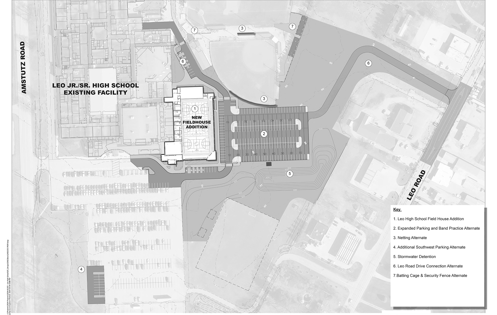 Leo High School: The JPR team led the civil engineering and landscape architecture efforts for a new Fieldhouse at Leo High School. This substantial addition significantly reshaped the surrounding campus and infrastructure. The design team thoughtfully integrated the building’s footprint into the site, coordinating the layout of drive aisles, parking areas, walkways, and utility systems to seamlessly connect with the new facility. The increase in impervious surfaces required the implementation of a comprehensive stormwater management plan. In addition to the Fieldhouse, the team enhanced the adjacent baseball and softball complex and designed new public water service connections to support both the existing campus buildings and the new addition.