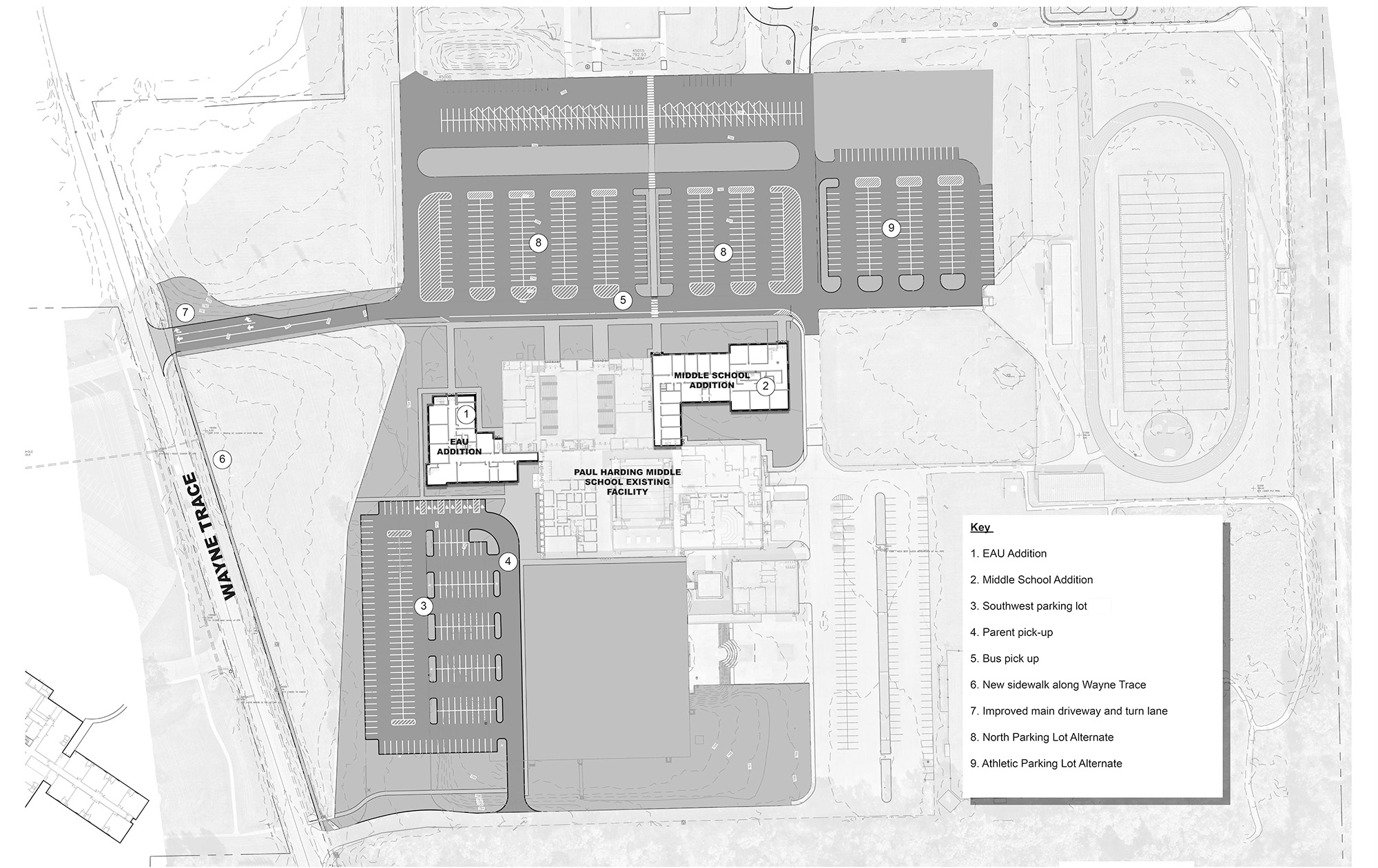 paul harding junior high: JPR collaborated with a multi-disciplinary design group to implement two additions to the existing Junior High facility. Alongside the building expansions, our team led campus-wide site improvements focused on enhancing access, parking, bus drop-off and parent pick-up areas, as well as pedestrian circulation routes. These upgrades are designed to foster a more functional, efficient, and safe educational environment. Serving as both civil engineer and landscape architect, JPR guided the site design from initial planning through final engineering – engaging stakeholders, building consensus, and coordinating closely with local regulatory agencies to secure necessary approvals.