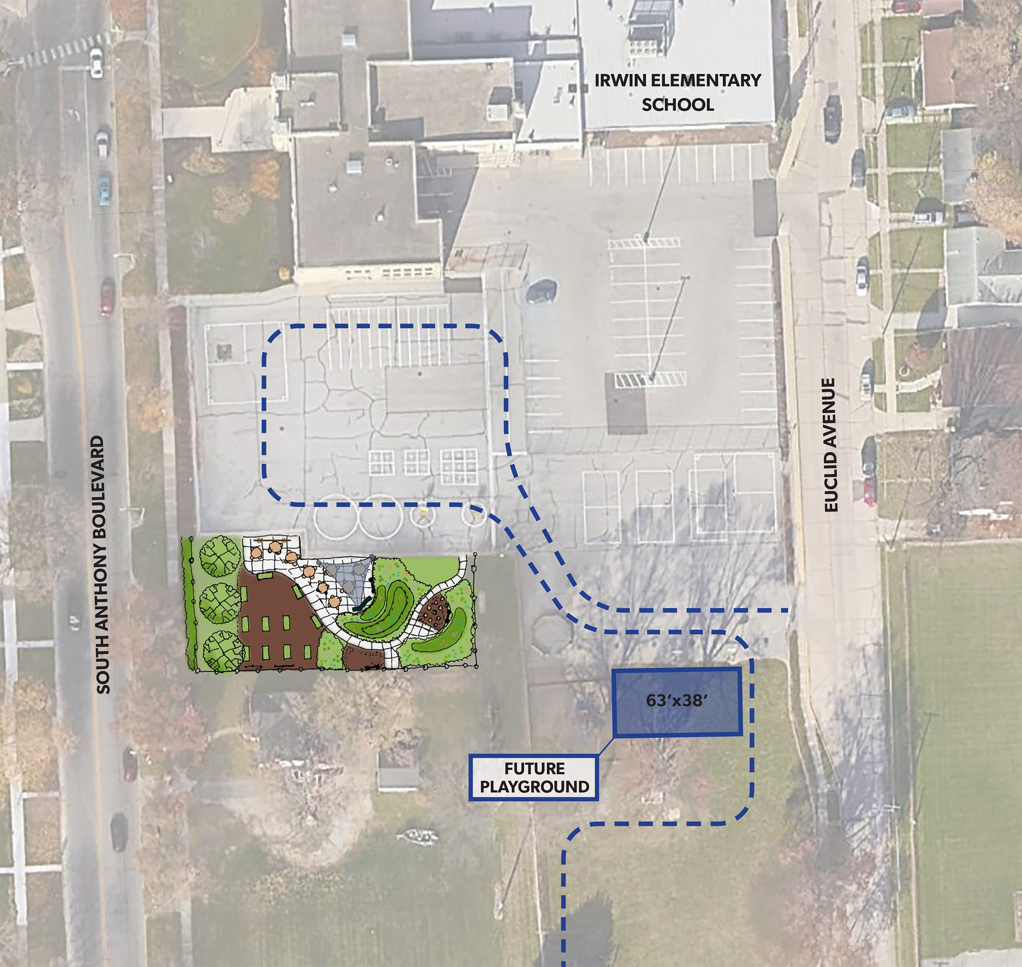 Irwin Elementary School (Grades: K-5): At this site, exterior improvements were proposed to support the school’s STEM curriculum. JPR provided conceptual design for an outdoor classroom surrounded by landscape and planter beds. It also included water tables to promote hands-on learning.